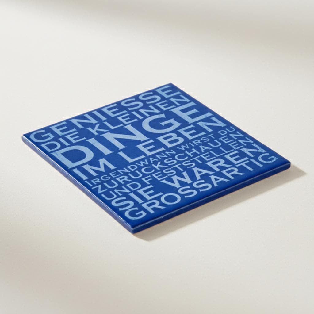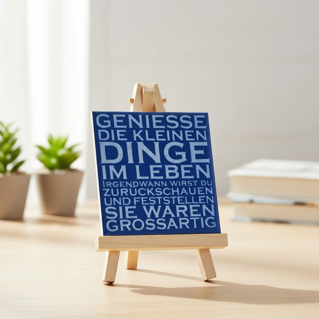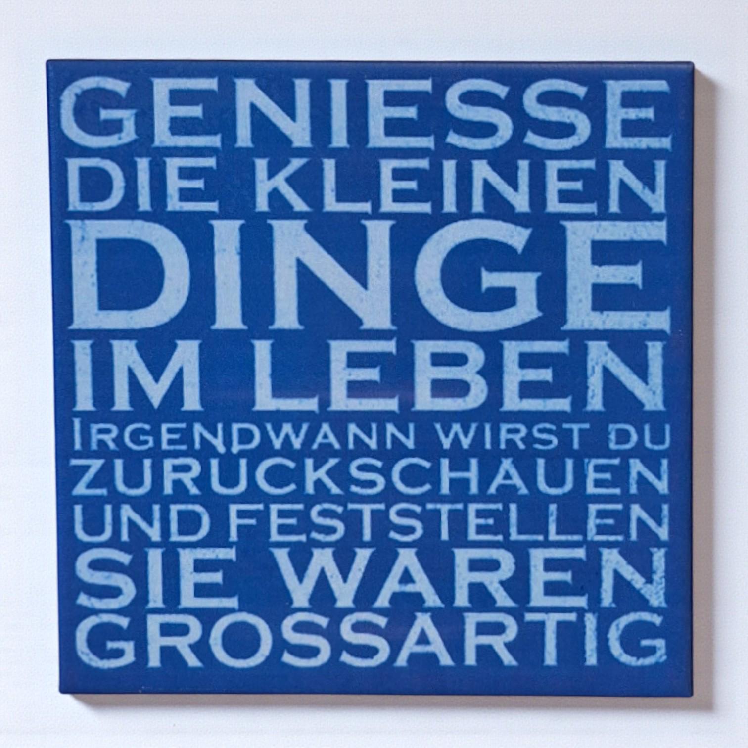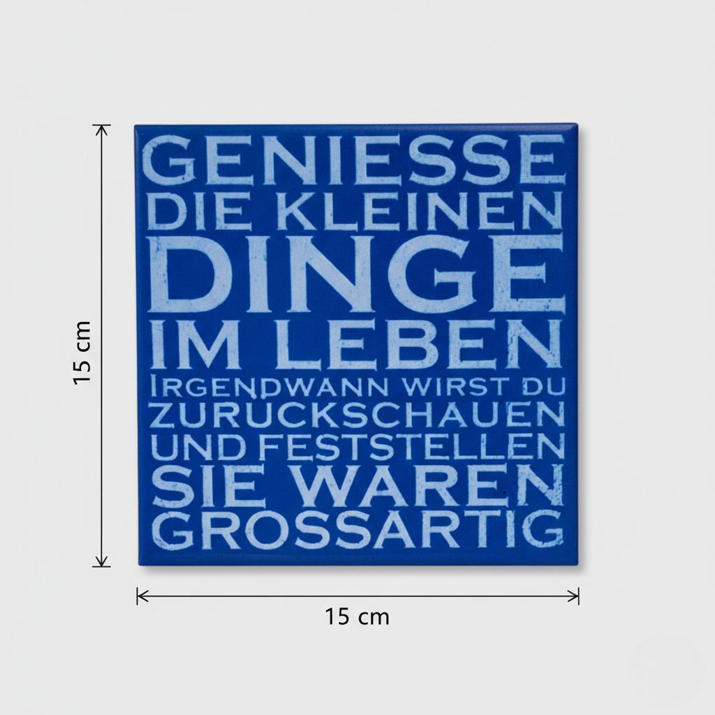 Diese Keramik-Motivfliese mit dem Spruch „Geniesse die kleinen Dinge im Leben“ bringt Ruhe und positive Gedanken in den Alltag.