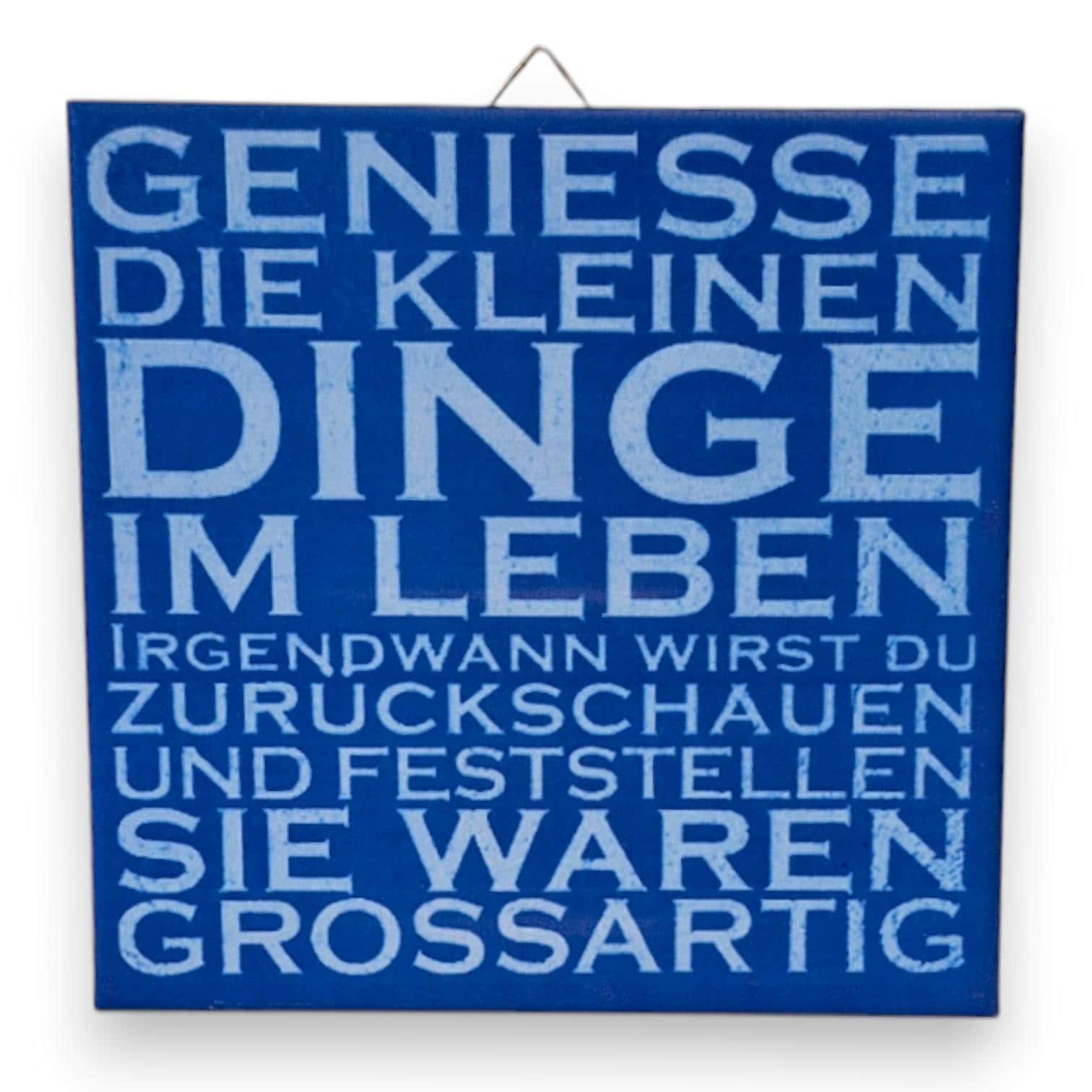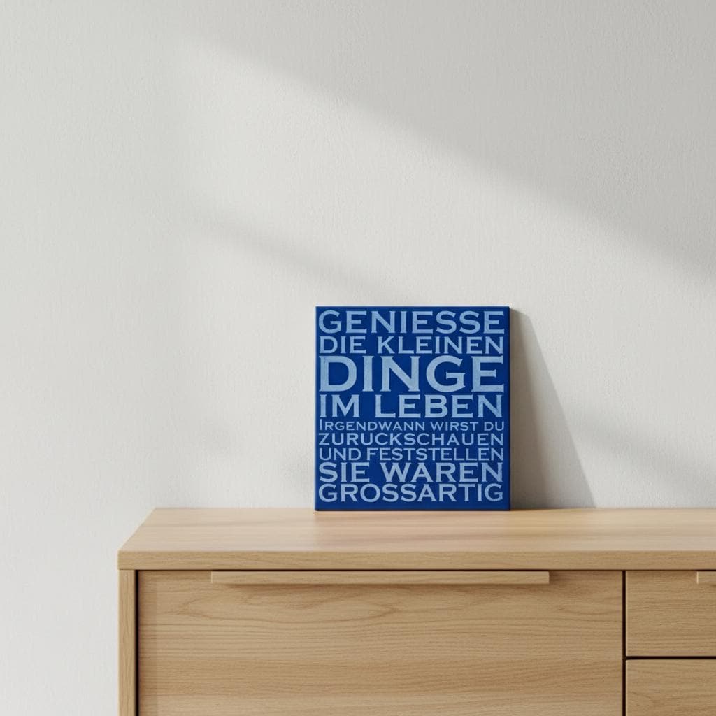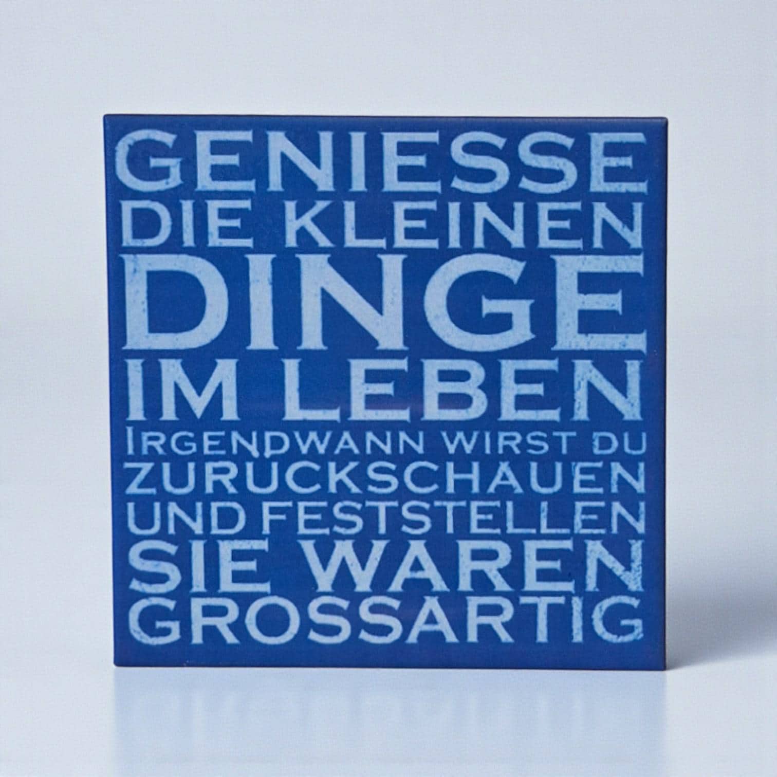Diese Keramik-Motivfliese mit dem Spruch „Geniesse die kleinen Dinge im Leben“ bringt Ruhe und positive Gedanken in den Alltag.