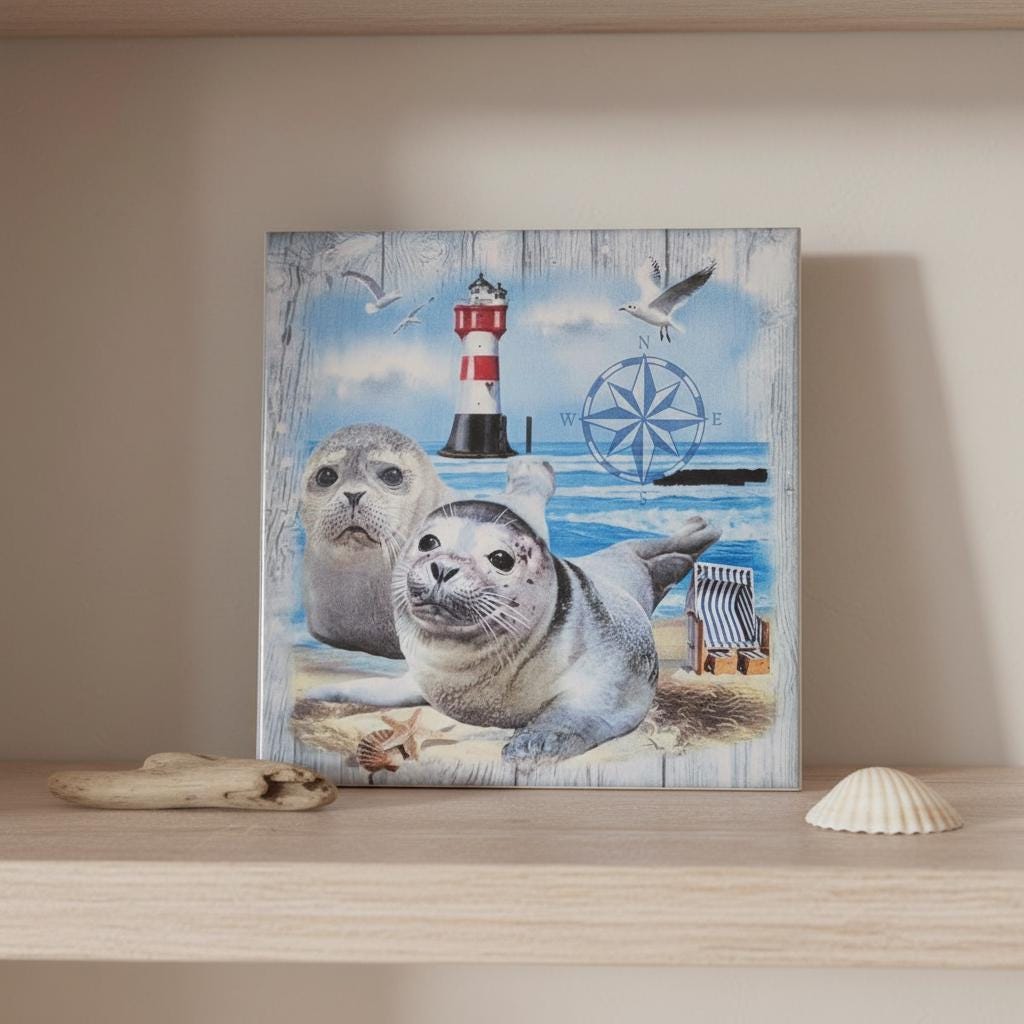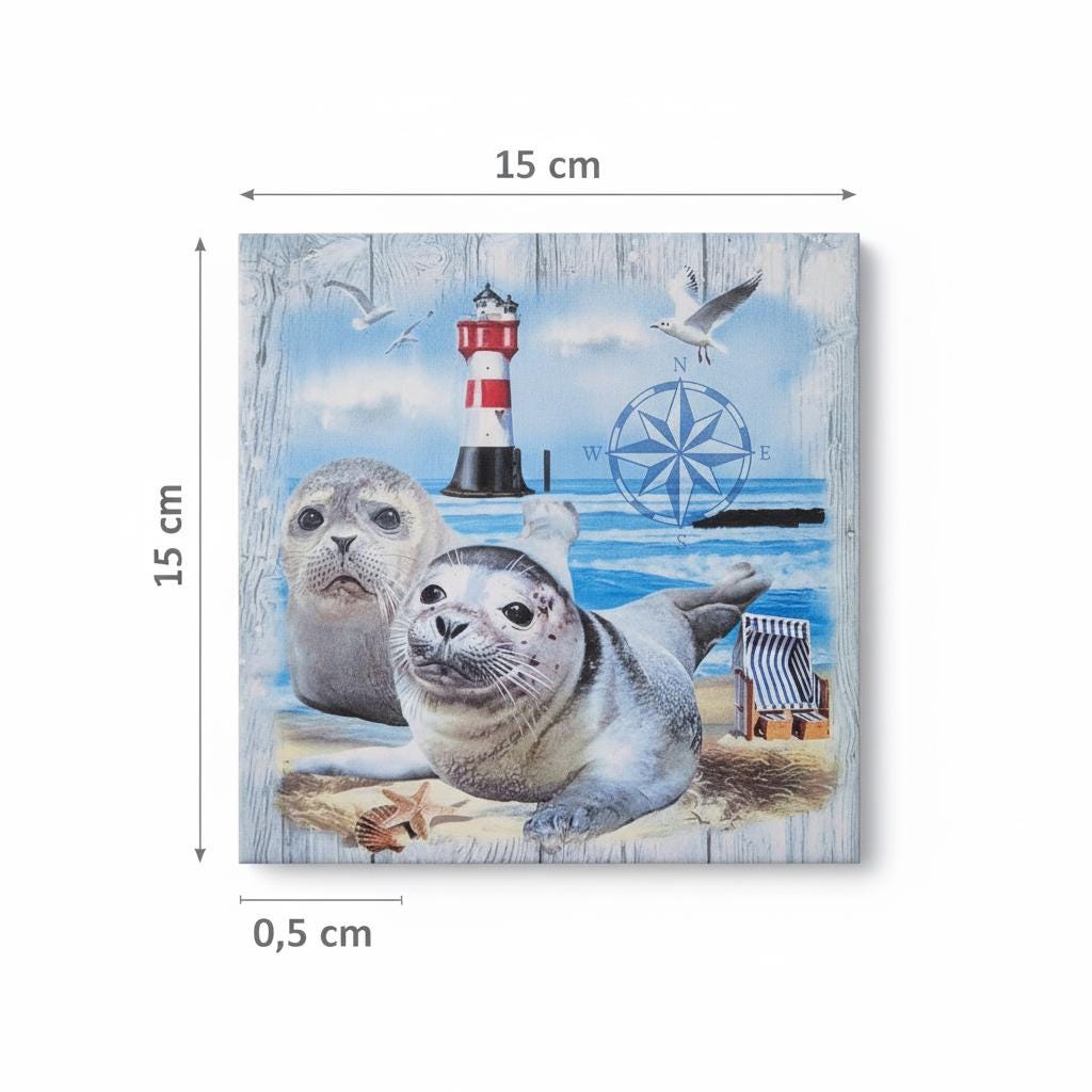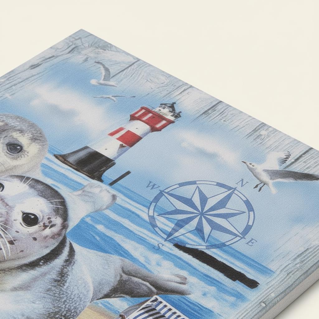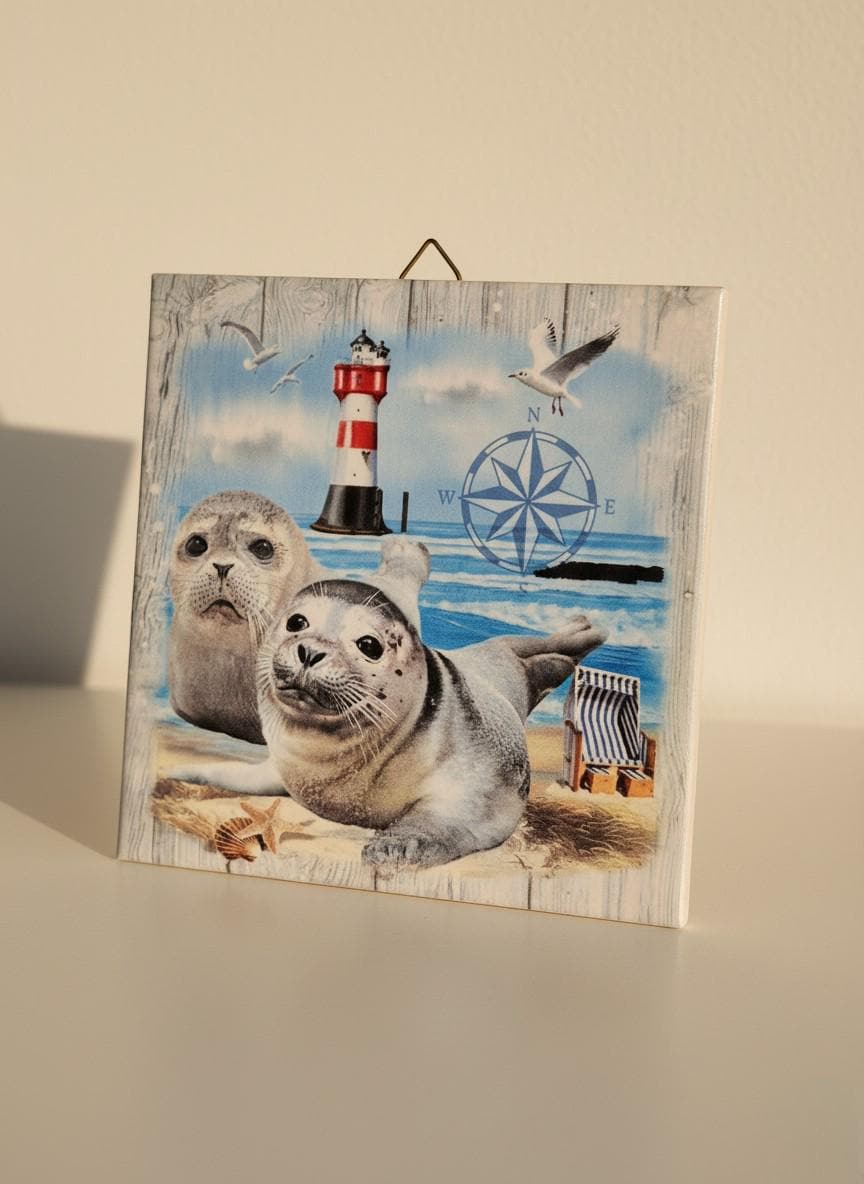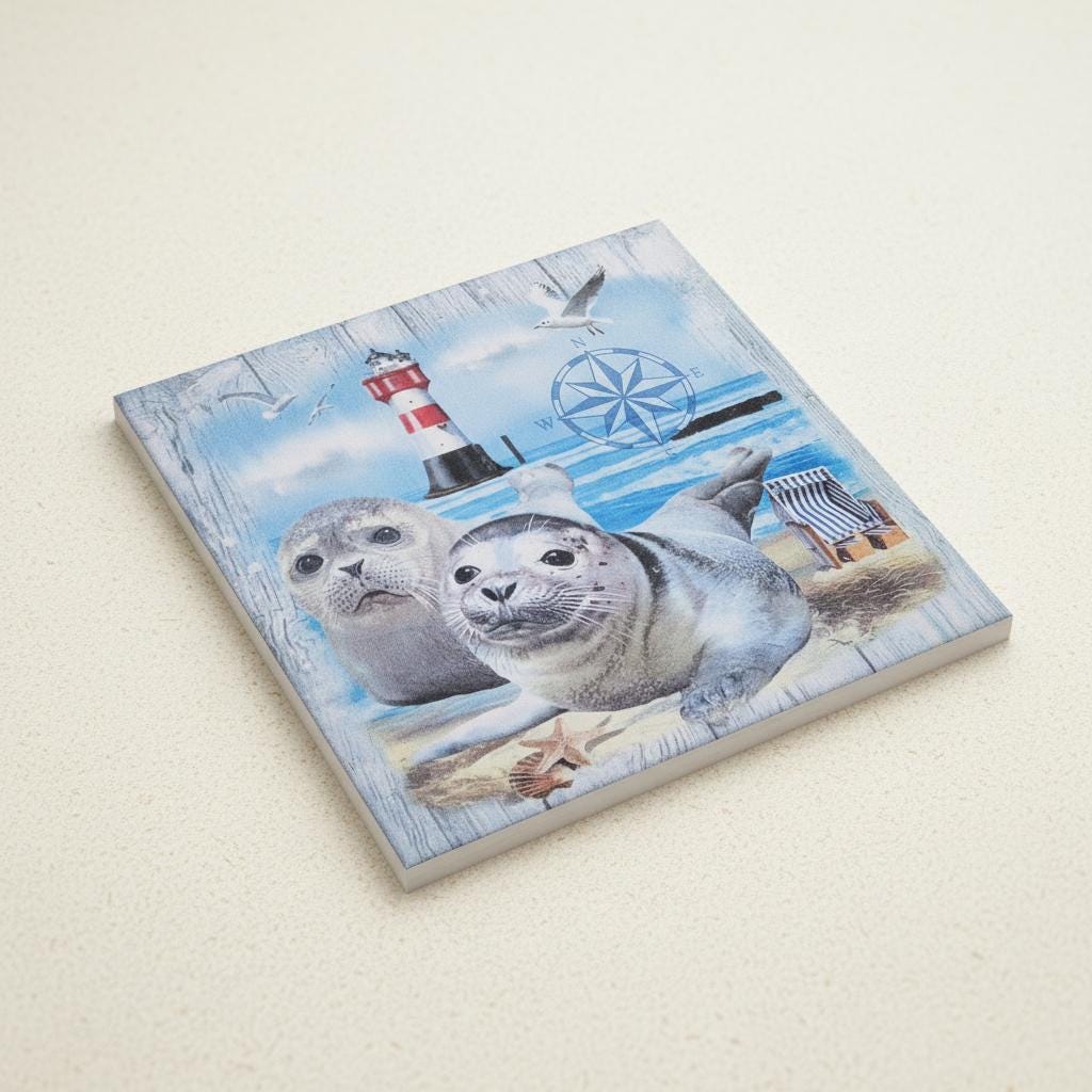 Bring coastal vibes to your home: This maritime-themed tile features two seals on a beach with a lighthouse and seaside scenery – perfect as a nautical accent wall. This ceramic tile with its image is a high-quality decorative tile for the kitchen, hallway, guest bathroom, or home bar, instantly bringing a nautical bathroom decor feel to your space.