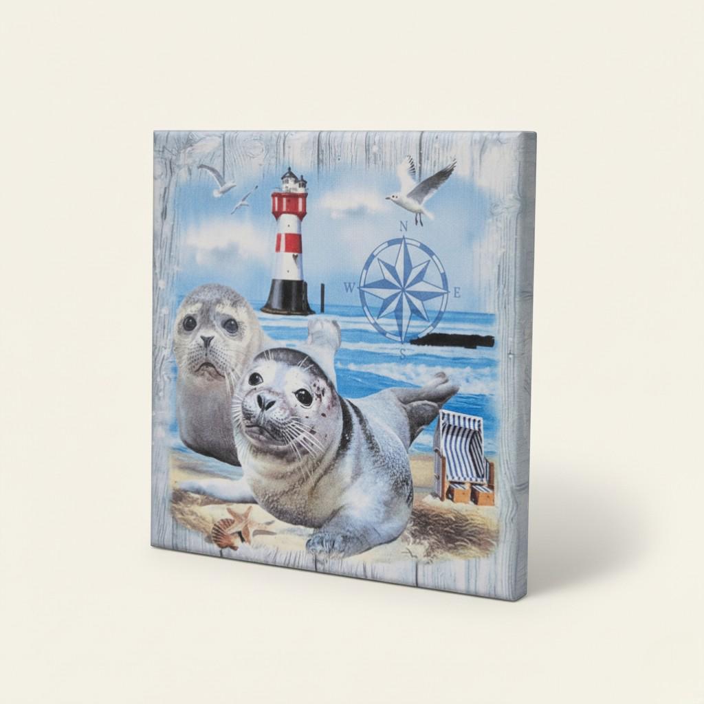 Motif: Seals, lighthouse, beach, seagulls – maritime collage look