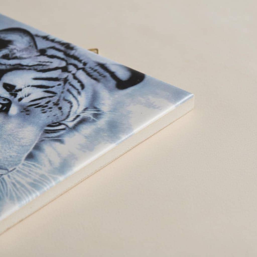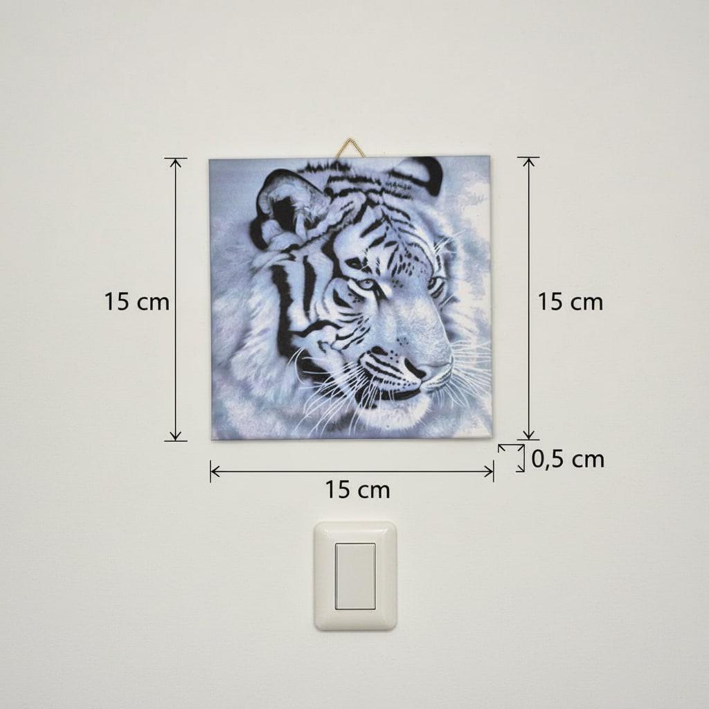 Die Fliese misst 15×15 cm und wird mit einem rückseitigen Aufhänger geliefert, sodass sie sofort als Wanddekoration eingesetzt werden kann. Auch auf einem Regal oder in einer kleinen Bildergalerie wirkt sie eindrucksvoll und modern. Durch den sorgfältigen Druck bleibt das Tiermotiv farbstabil und pflegeleicht.
