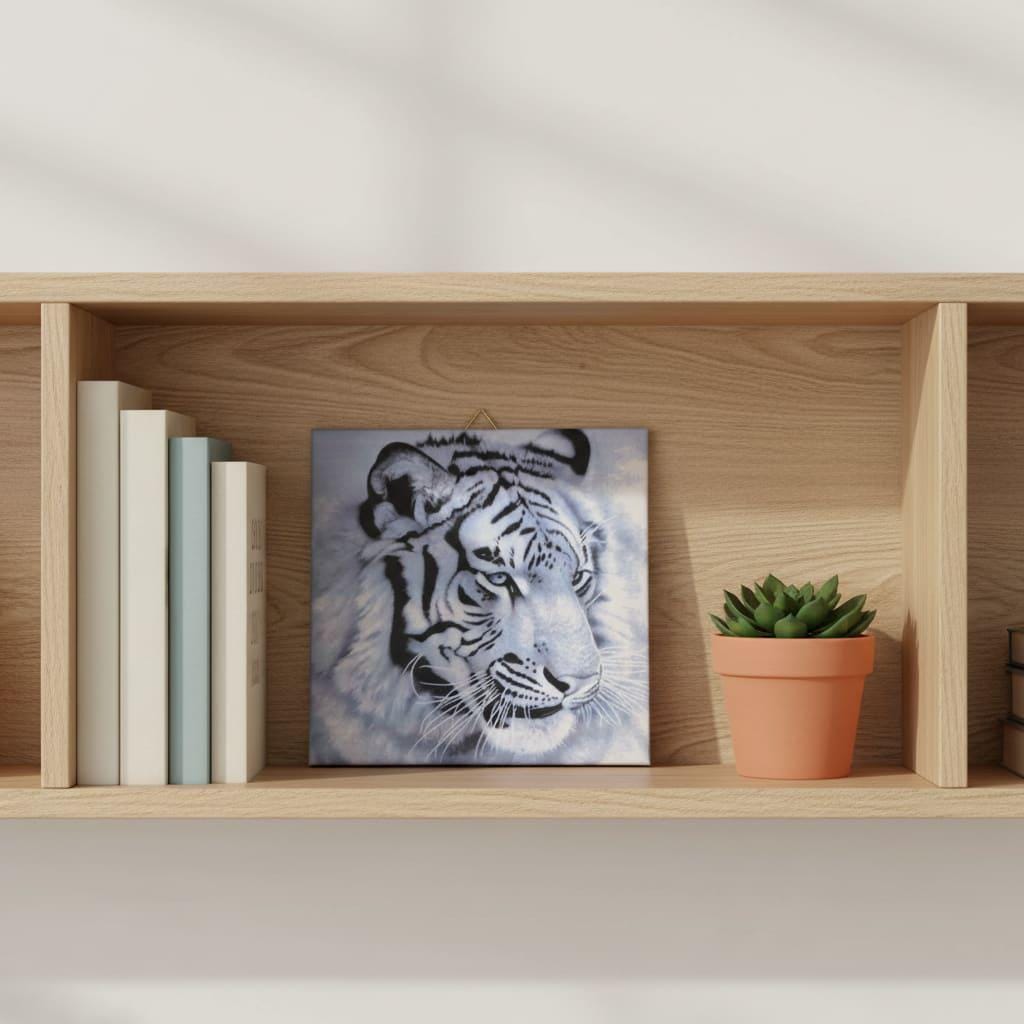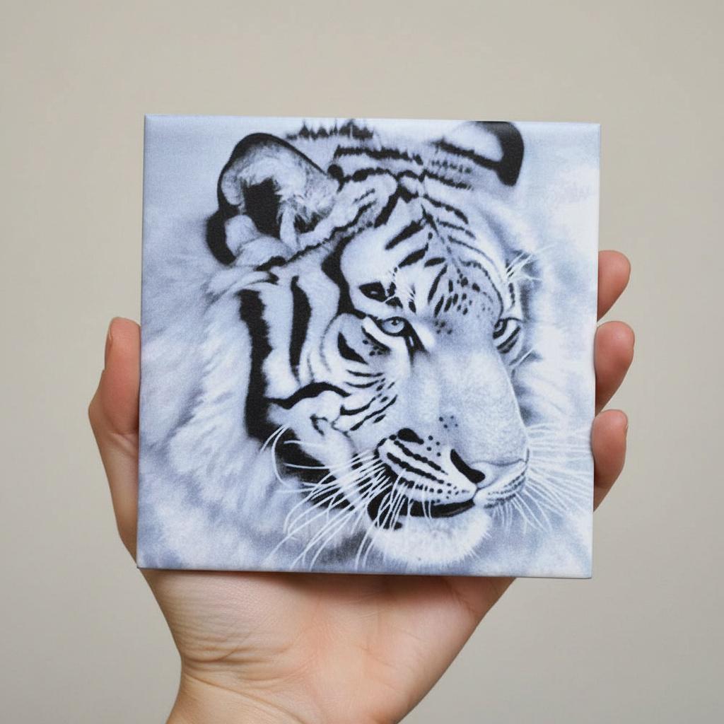 Diese hochwertige Keramik-Bildfliese mit einem detailreichen Porträt eines weißen Tigers bringt Stärke, Eleganz und eine besondere Atmosphäre in dein Zuhause. Das Motiv ist klar, kontrastreich und wirkt wie ein kleines Kunstwerk – ideal als dekorativer Akzent in Wohnräumen, Flur, Büro oder Bad.