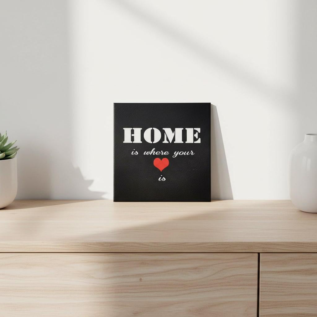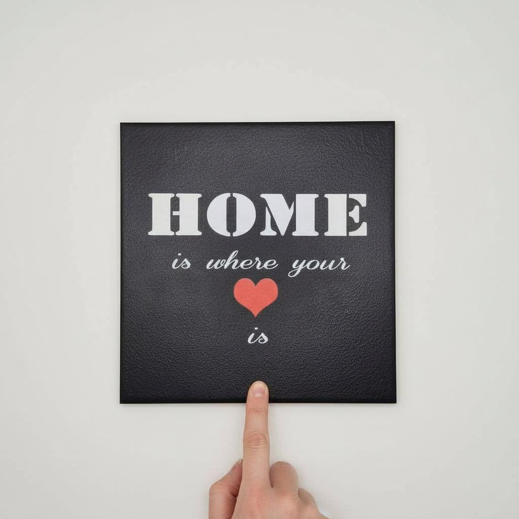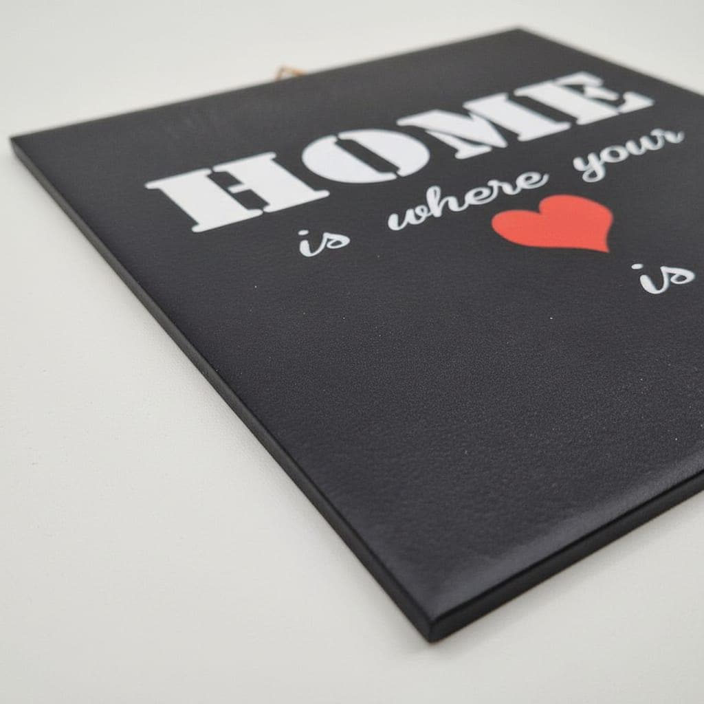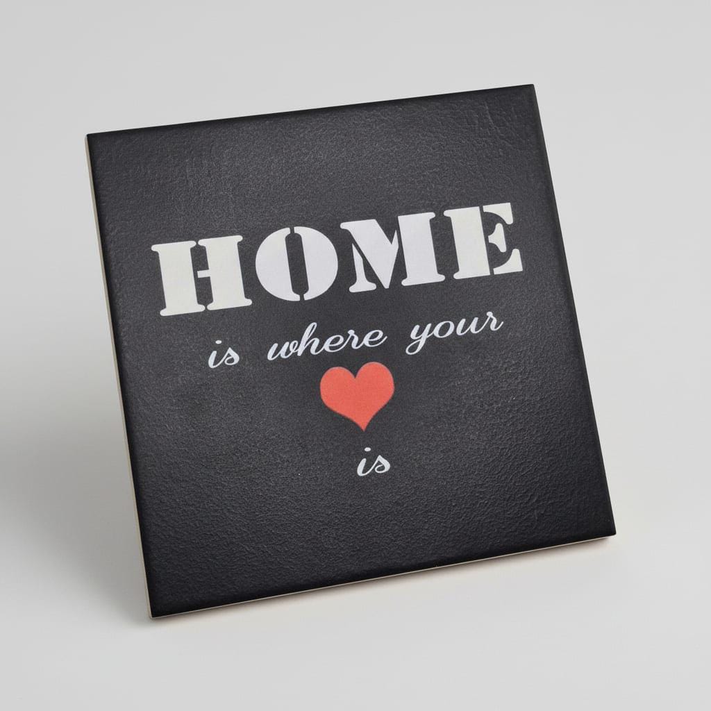 Diese schwarze Keramikfliese mit Spruch „Home is where your heart is“ ist eine stilvolle Wanddekoration für alle, die ihr Zuhause bewusst und persönlich gestalten möchten. Der kontrastreiche Schriftzug in Weiß, kombiniert mit einem roten Herz, sorgt für eine klare Aussage und einen modernen Look.