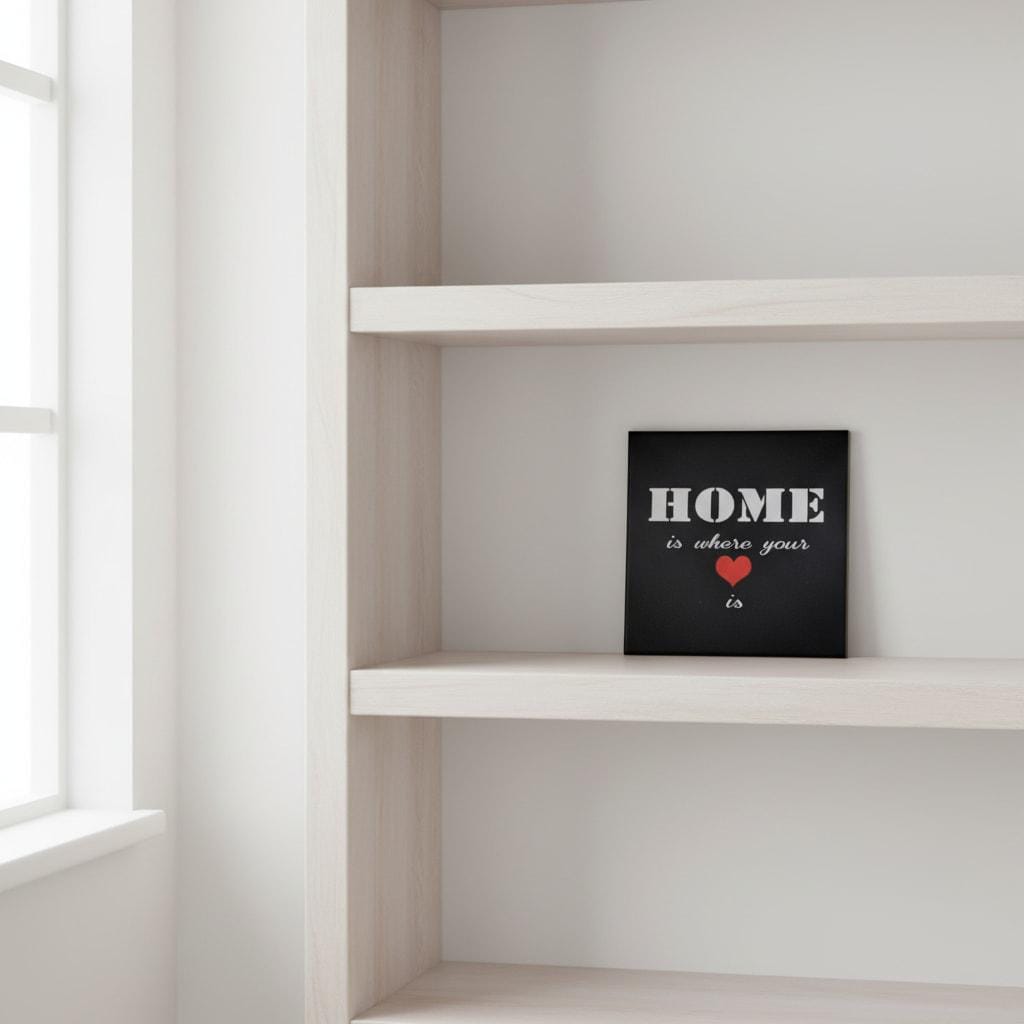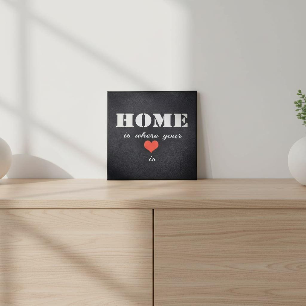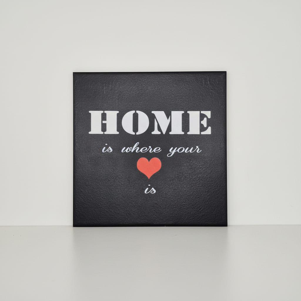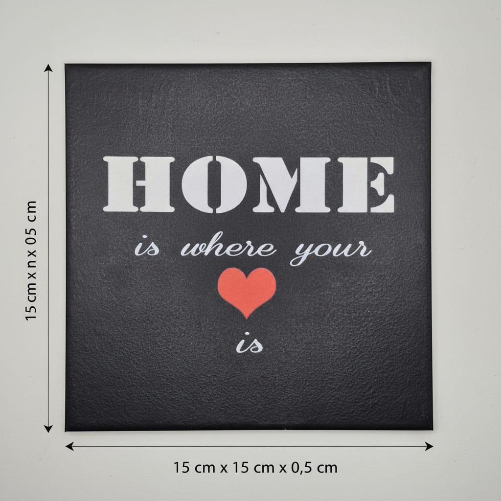 Diese schwarze Keramikfliese mit Spruch „Home is where your heart is“ ist eine stilvolle Wanddekoration für alle, die ihr Zuhause bewusst und persönlich gestalten möchten. Der kontrastreiche Schriftzug in Weiß, kombiniert mit einem roten Herz, sorgt für eine klare Aussage und einen modernen Look.