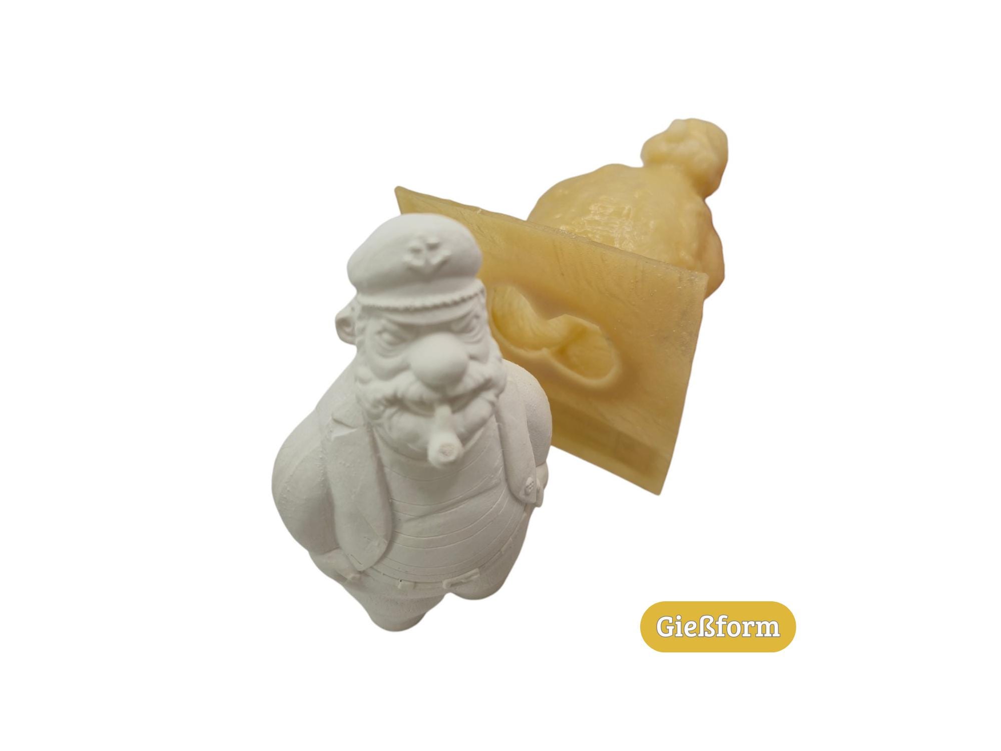 Handgefertigte Latex-Vollform, wiederverwendbar; feine Details (Bart, Mütze, Pfeife).