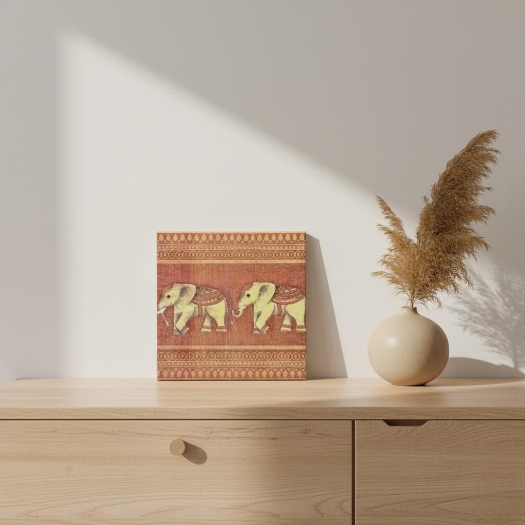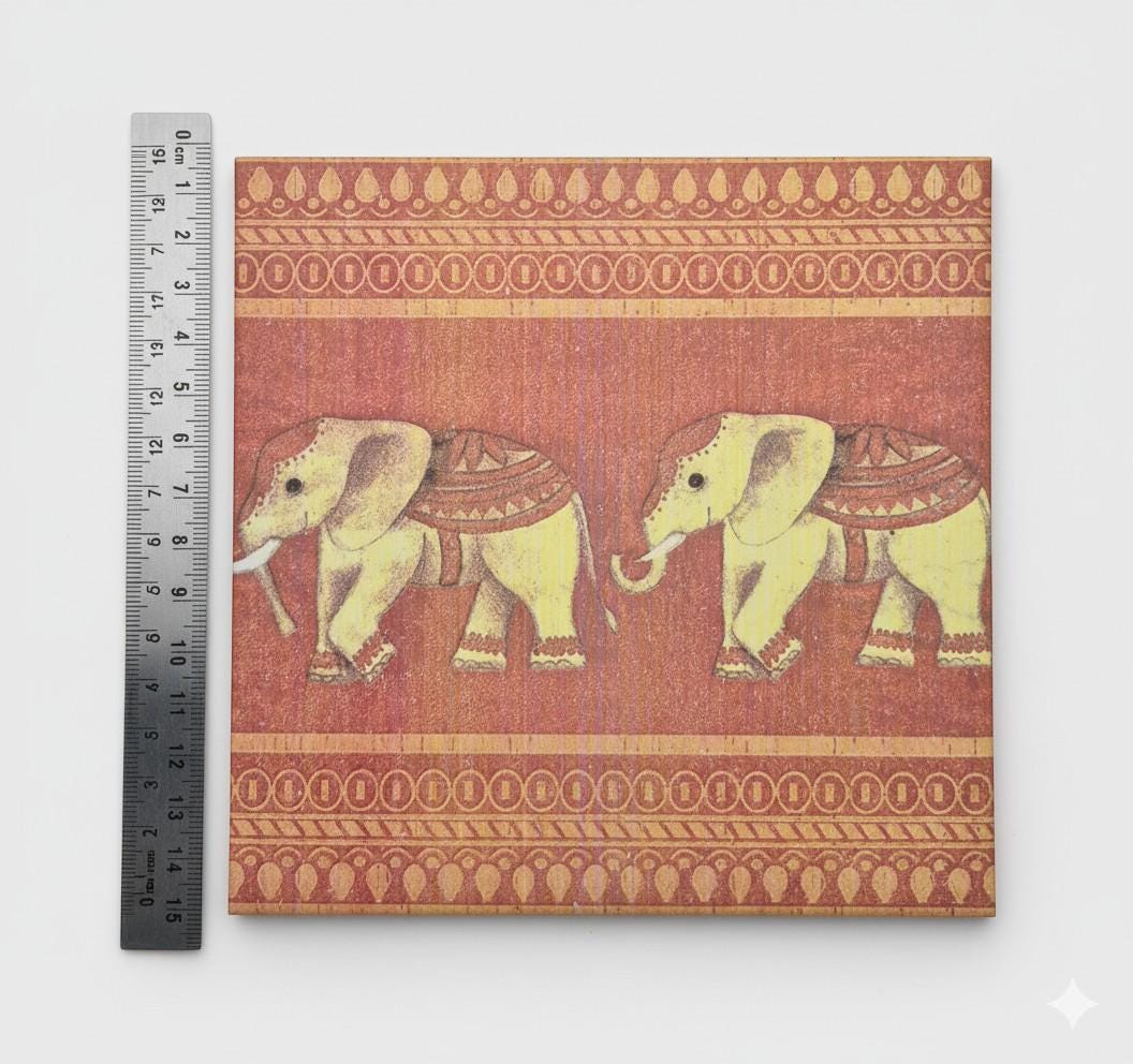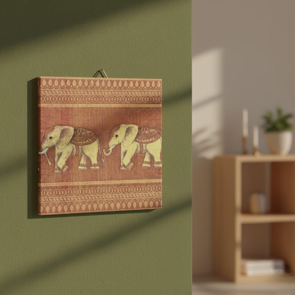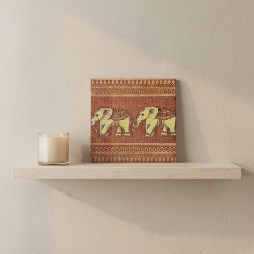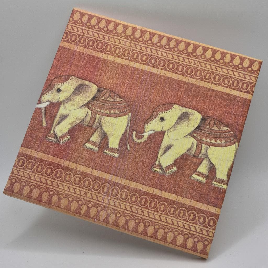 Motif: Two stylized, Indian-looking elephants on a warm terracotta background – a picture tile with an elephant that instantly brings coziness and ethnic vibes to your home.