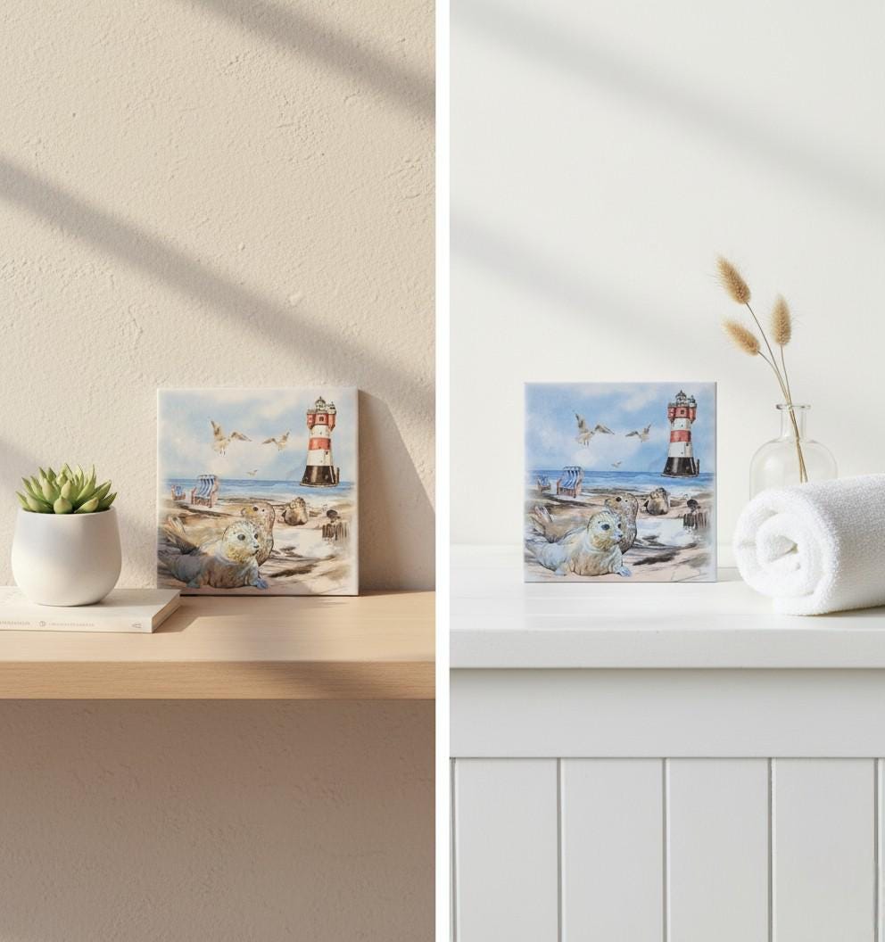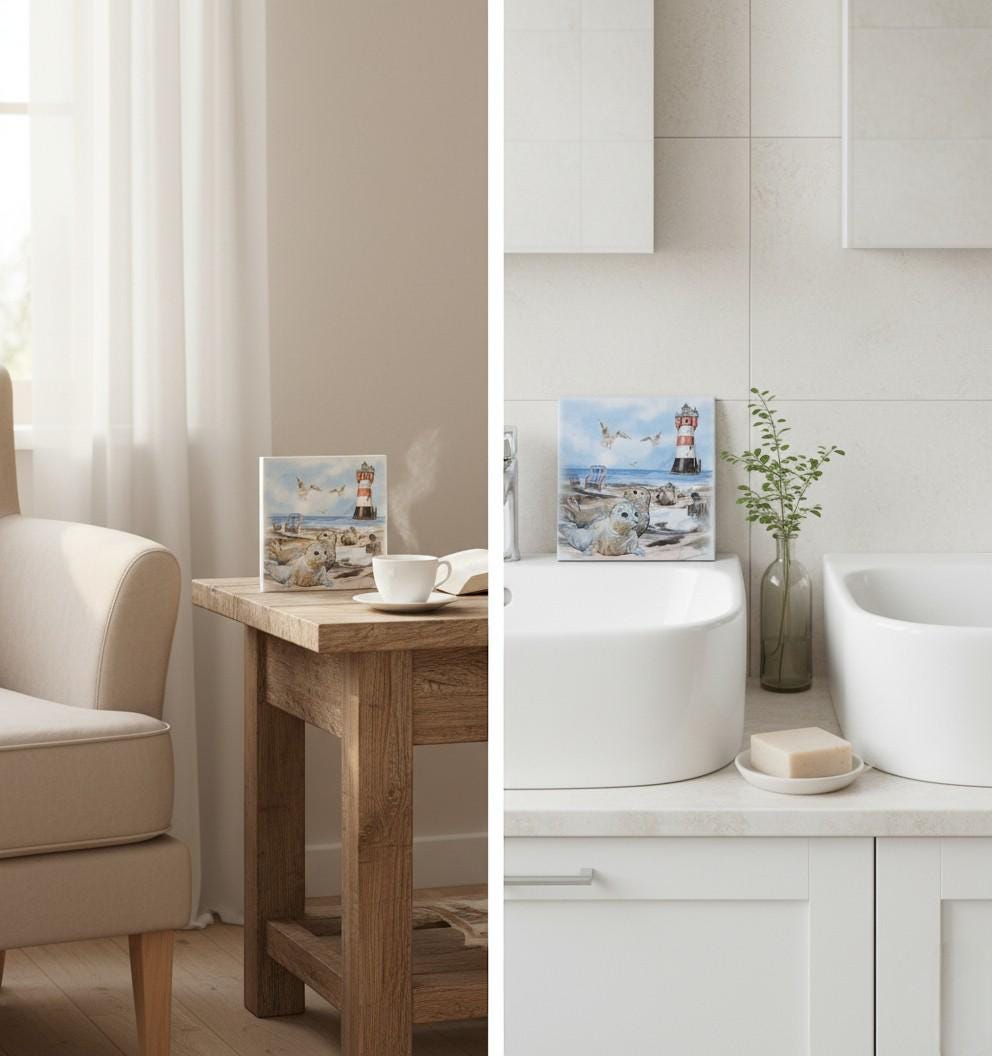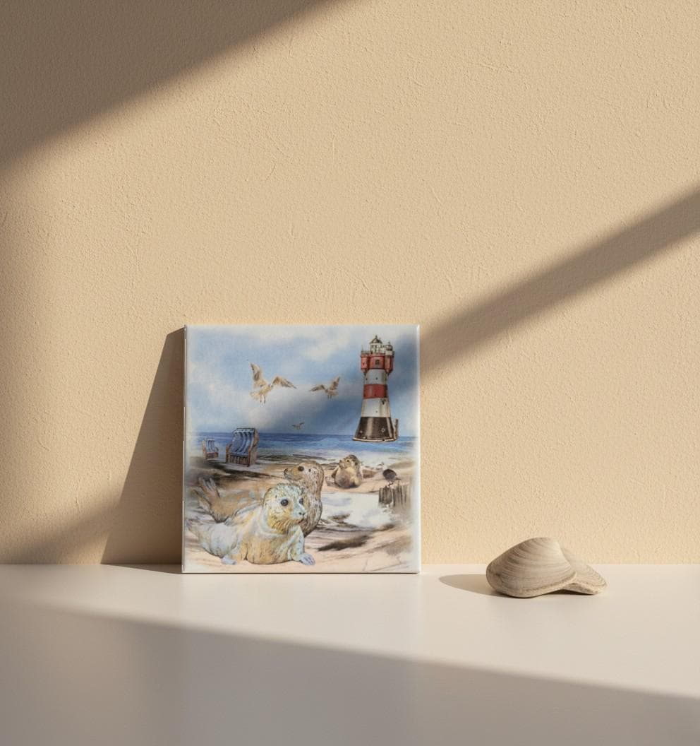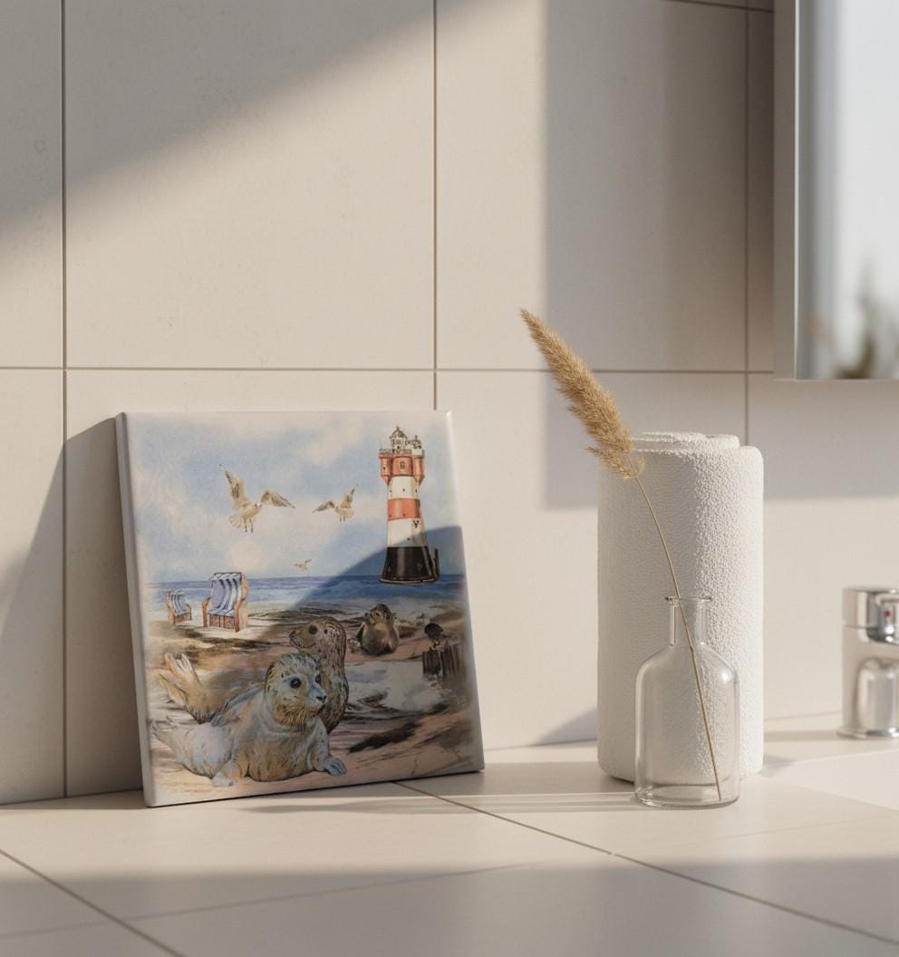 Ceramic tile with a printed image, flat on the back – for standing (with stand), leaning, or hanging. This maritime-themed wall tile depicts two seals on the beach, seagulls in flight, and a red lighthouse – instantly bringing a coastal feel to your home. The hand-finished ceramic seal tile is suitable as a standing decoration, for leaning, or for hanging (hanger included). As a maritime decorative tile, it adds a fresh touch to bathrooms, guest toilets, and kitchens; as bathroom decor, it harmonizes with light natural tones, wood, and linen.