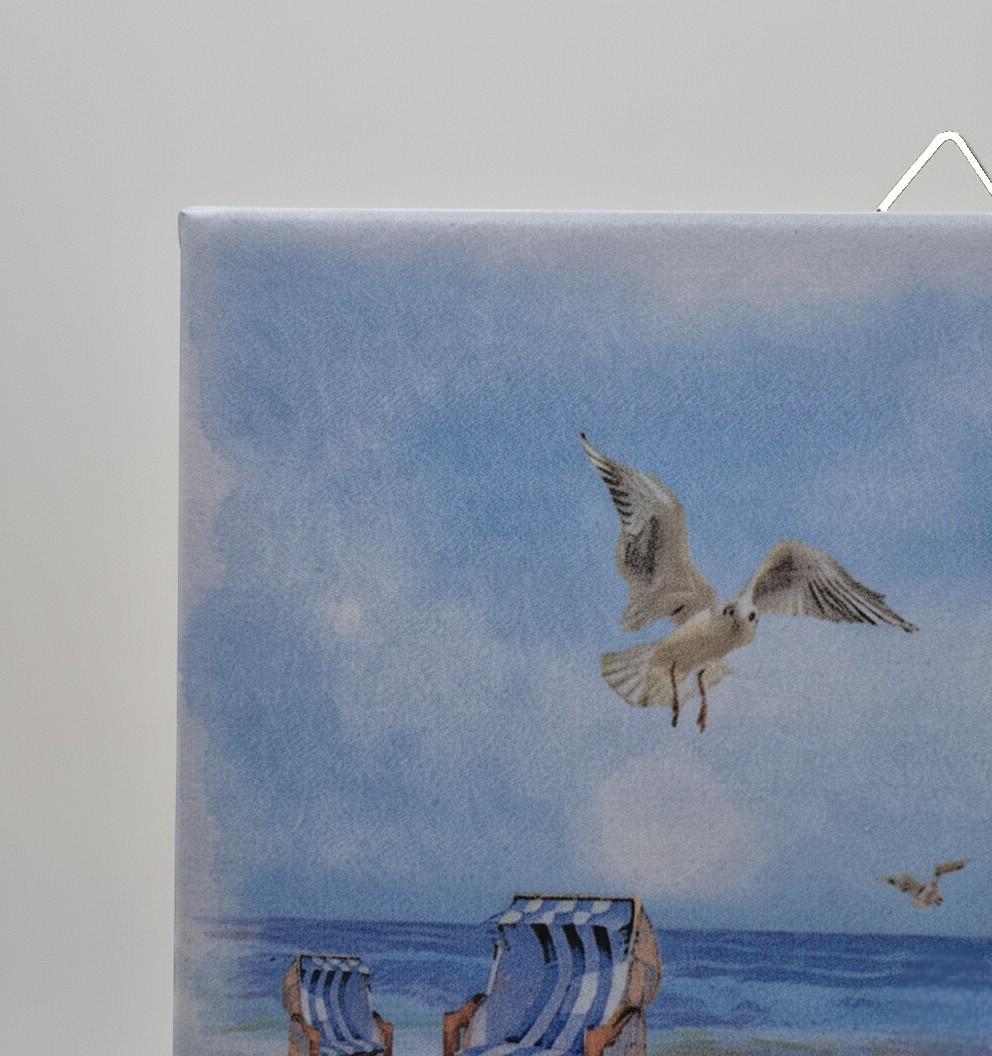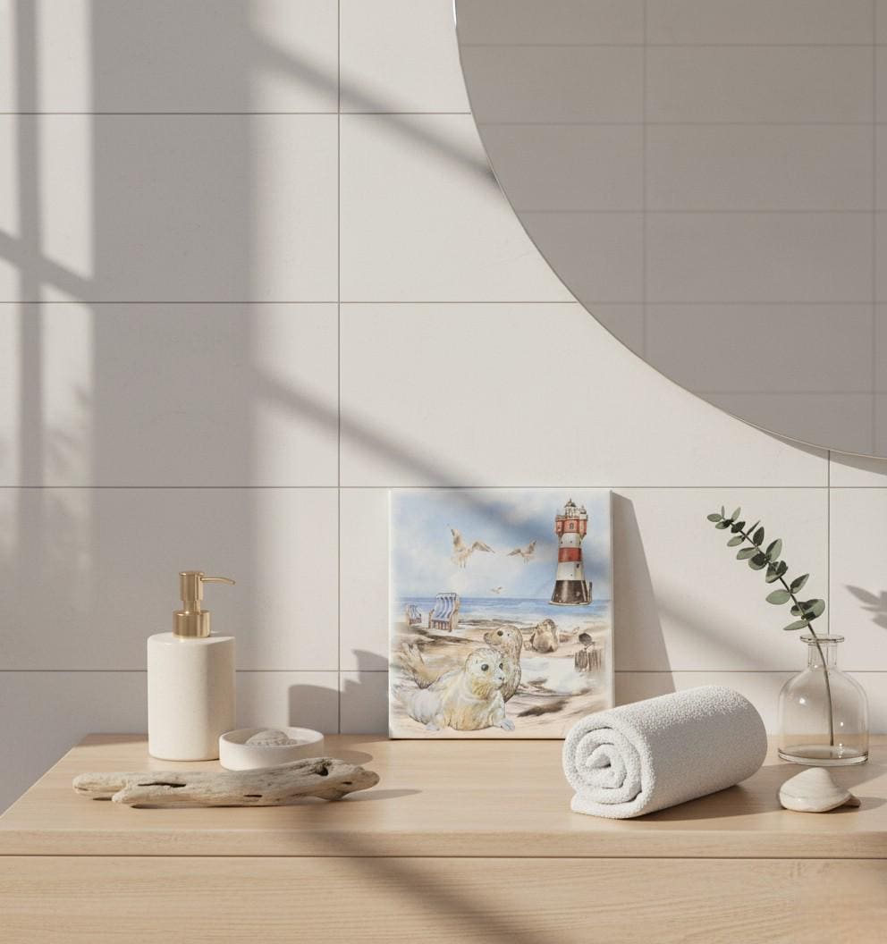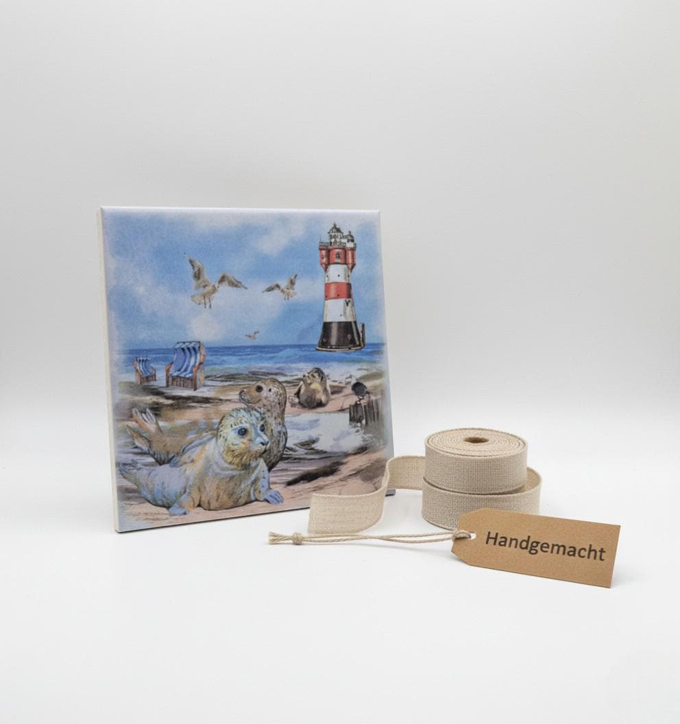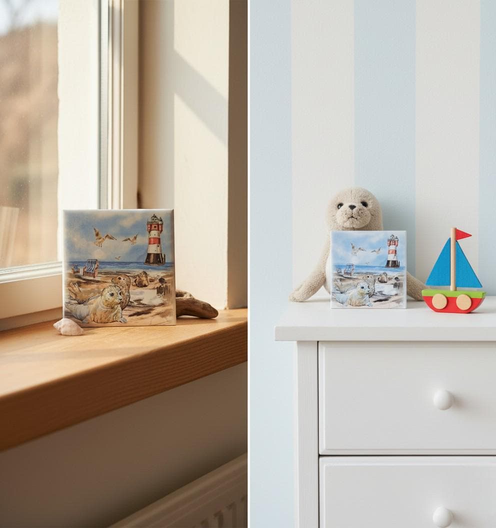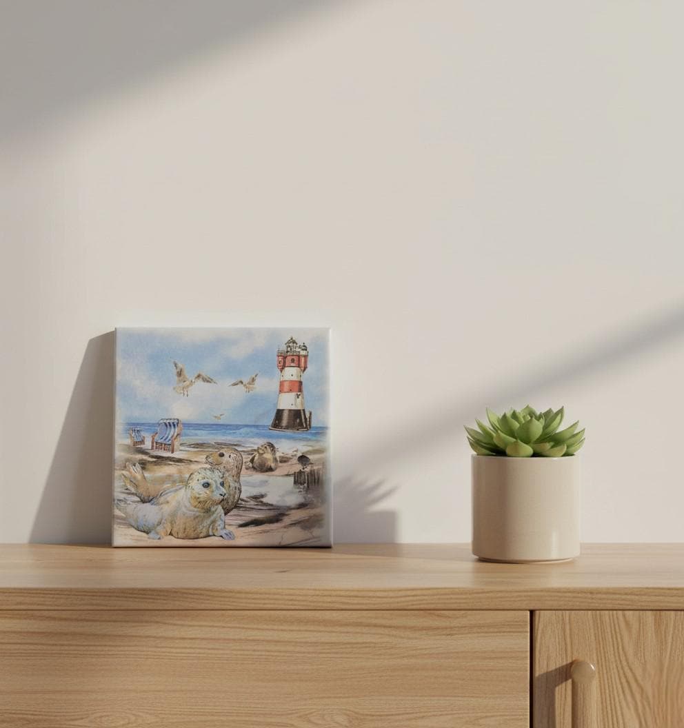 Ceramic tile with a printed image, flat on the back – for standing (with stand), leaning, or hanging. This maritime-themed wall tile depicts two seals on the beach, seagulls in flight, and a red lighthouse – instantly bringing a coastal feel to your home. The hand-finished ceramic seal tile is suitable as a standing decoration, for leaning, or for hanging (hanger included). As a maritime decorative tile, it adds a fresh touch to bathrooms, guest toilets, and kitchens; as bathroom decor, it harmonizes with light natural tones, wood, and linen.