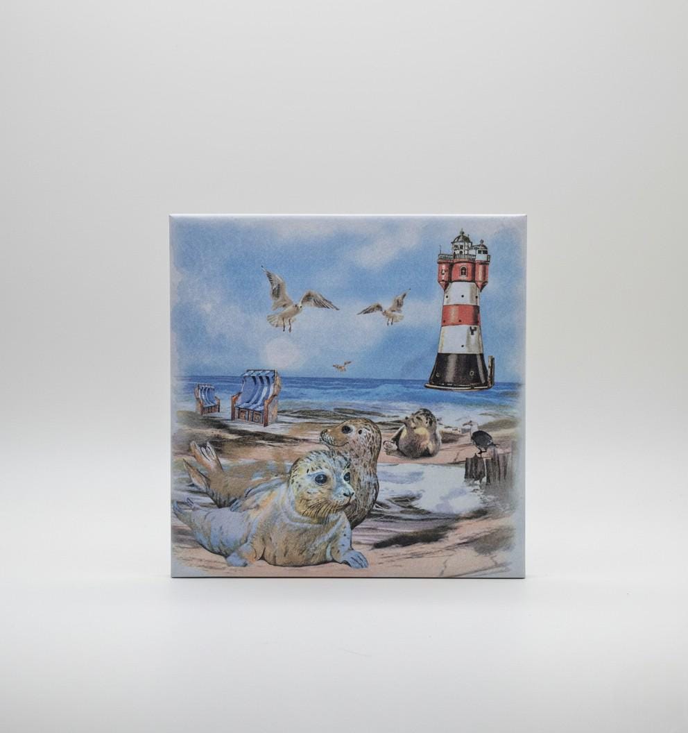 The maritime "Seals on the Beach" picture tile is a handmade decorative ceramic tile. The clear acrylic lacquer gives the motif a beautiful depth and is easy to clean (dust-dry wipeable).