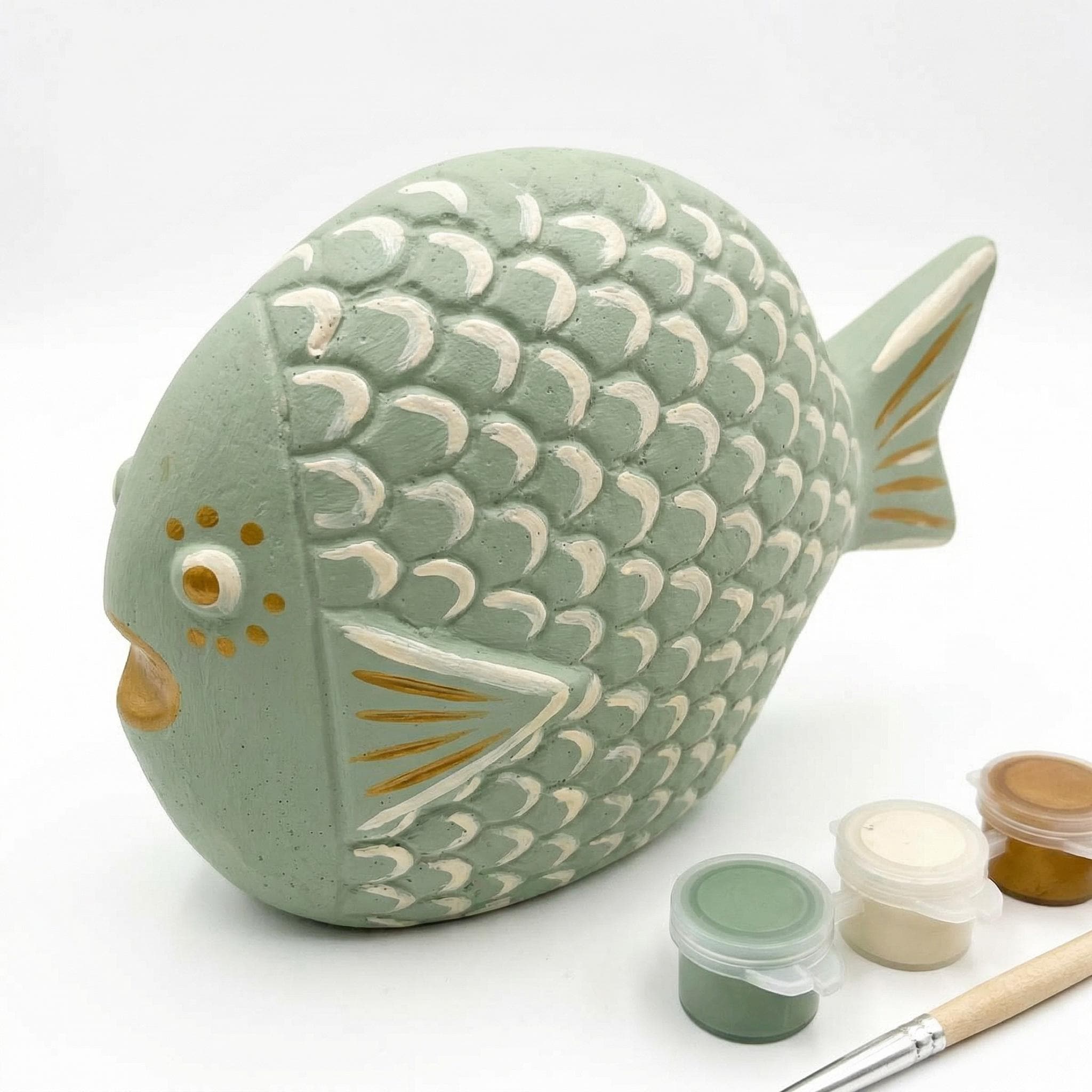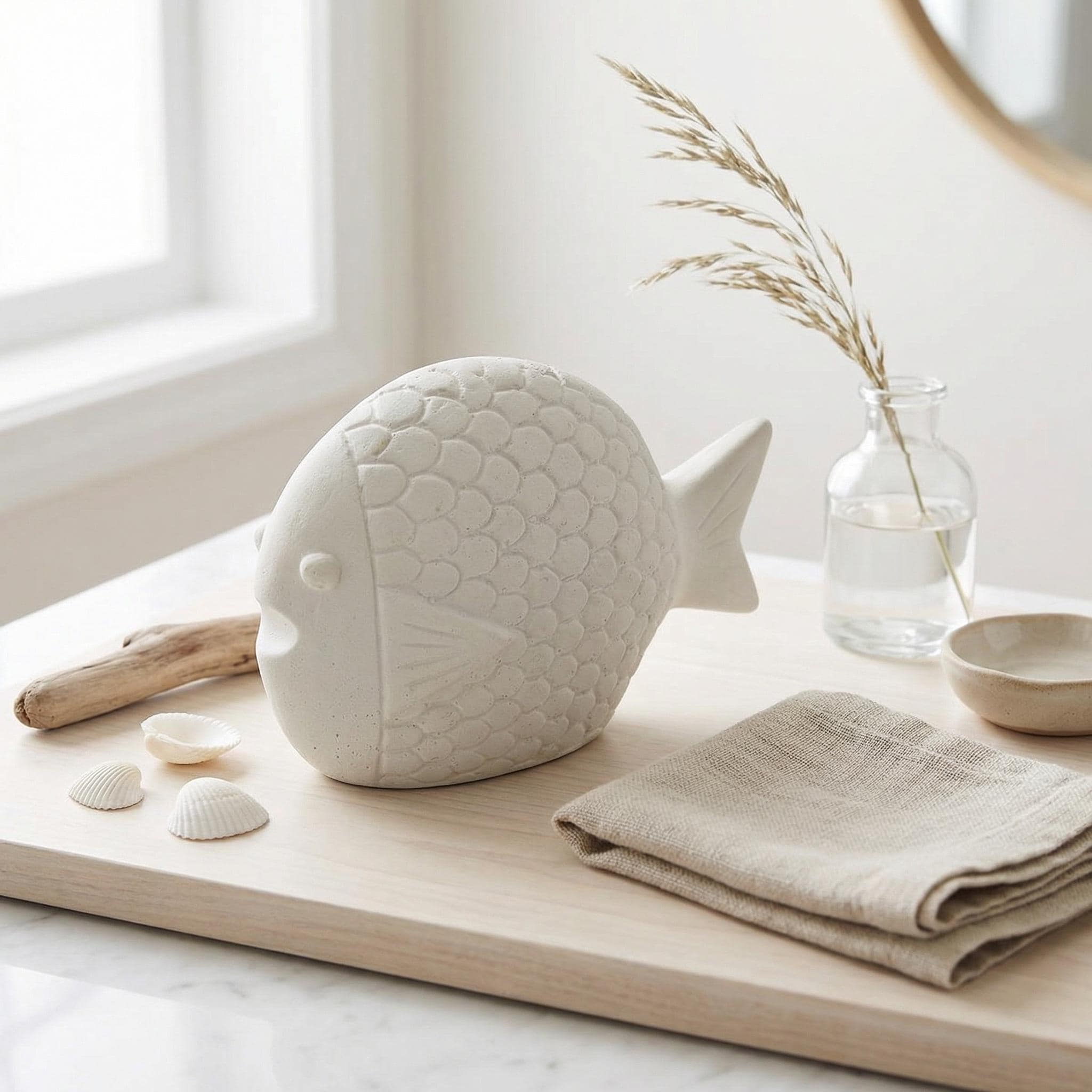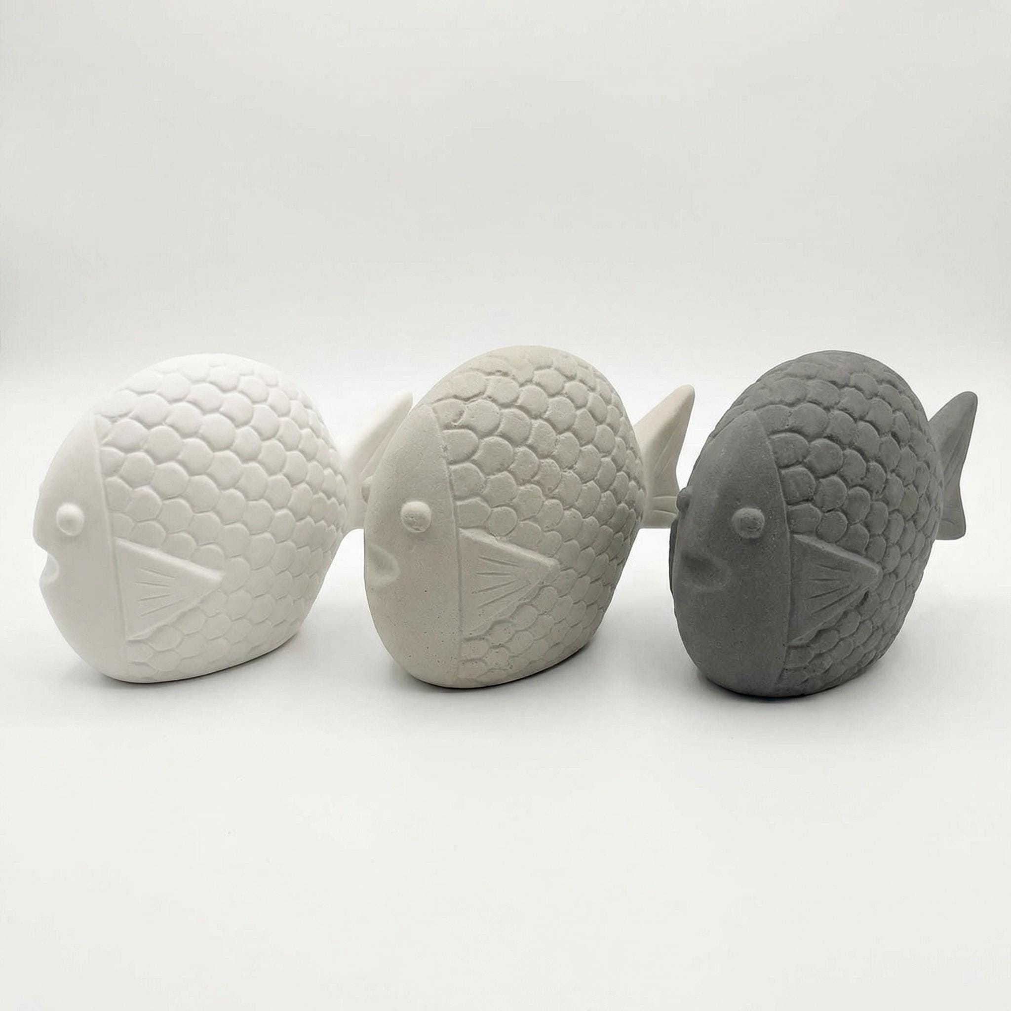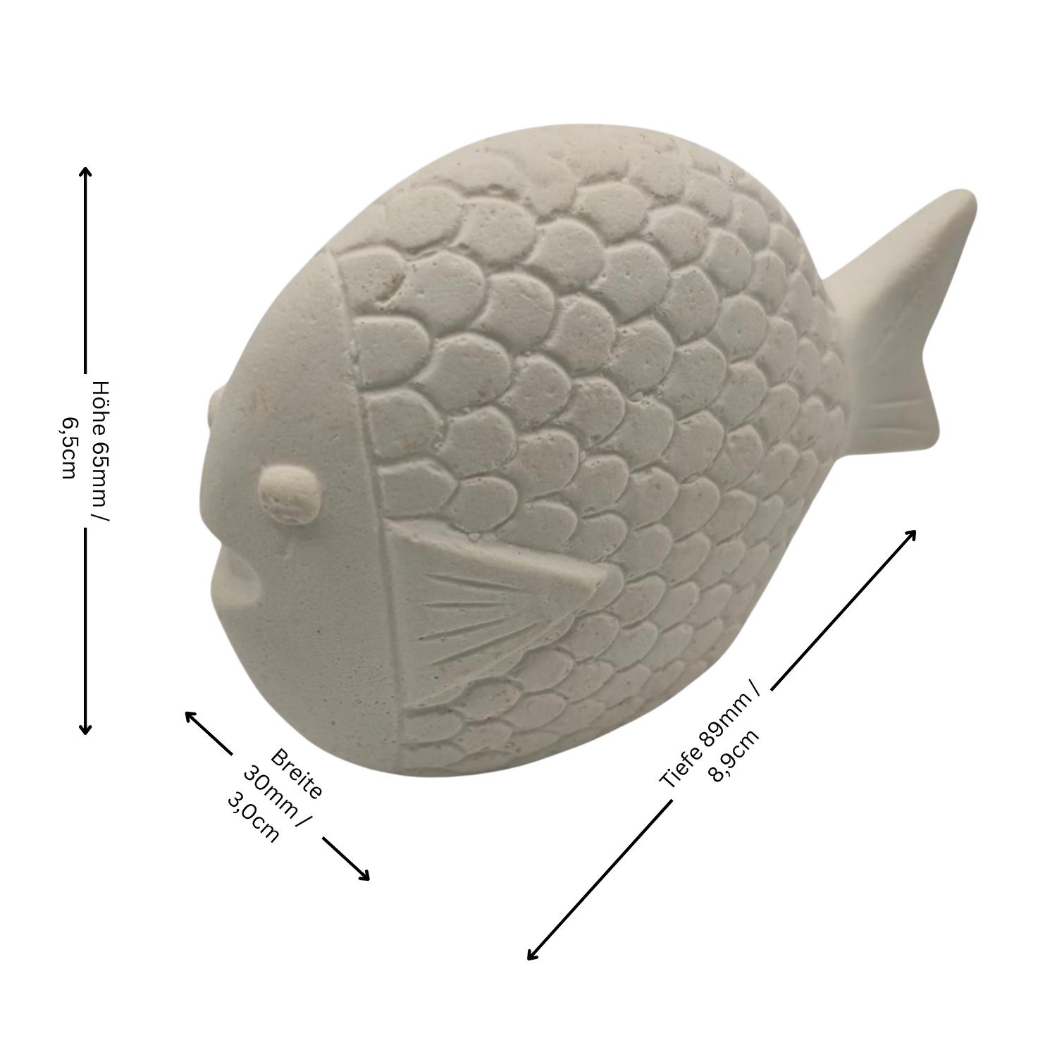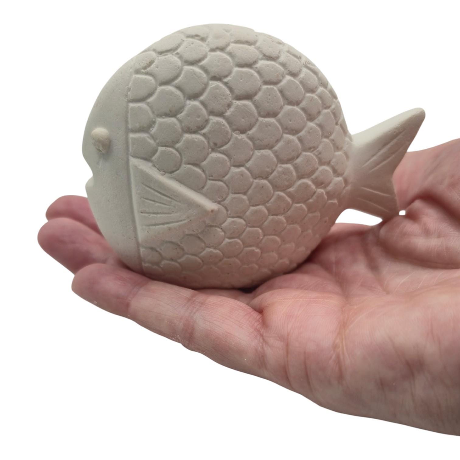 Dieser Fisch ist handgemacht in meinem Atelier in Oberhaid – jede Schuppe sitzt, jedes Detail stimmt. Die runde, kompakte Form mit dem wunderschönen Schuppenmuster ist ein echter Hingucker: als Betonfigur auf der Fensterbank, im Badezimmer oder als persönliches Geschenk, das man so nicht kaufen kann.